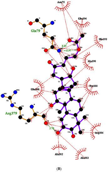 | ZINC95486305 | −8.8 | Gln79, Arg379 | Asn75, Glu396, His393, Ala390, Glu380, Tyr388, Arg386, Ala382, Ala383 |