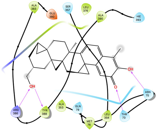 | ZINC95486007 | −8.7 | Glu380, Asn75, Ala390 | Met76, Gln79, Leu354, Ser357, Met358, Leu361, Ala362, Tyr365, Tyr373, Leu376, His393, Glu396 |