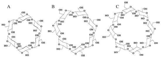 More than 60,000 technical papers and patents are available on the structural and functional properties, production and utilization of cyclodextrins. The cyclic structure of the α-, β-, and γ-CDs (consisting of 6, 7 or 8 glucopyranose units, respectively) is shown in Figure 1 [1,2]. The use of cyclodextrins is spreading enormously for many reasons, such as [3]: