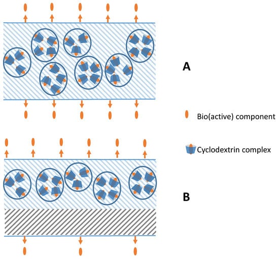Cyclodextrin complexes are embedded into: (A) a polymer or (B) a coating layer on the polymer.
