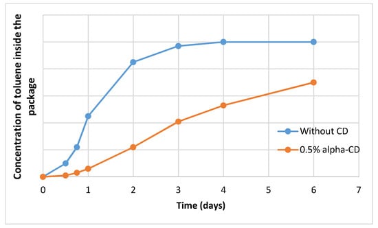 The penetration of toluene vapor into a closed package was characterized by a lag-phase (the saturation of the packaging matrix) and a transmission phase and finally the saturation level (Figure 3) [110]. When CD-traps were built into the packaging film, the lag-phase was considerably longer, and the steady state phase showed a slower increase in concentration of permeant inside the package.