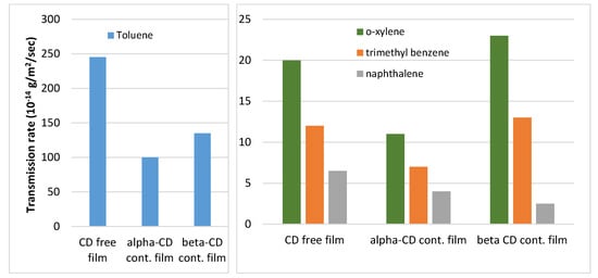 Transmission rate of several aromatic hydrocarbons through a usual, and through 0.5% α- and β-CD-containing polyethylene films (based on data from [110]).