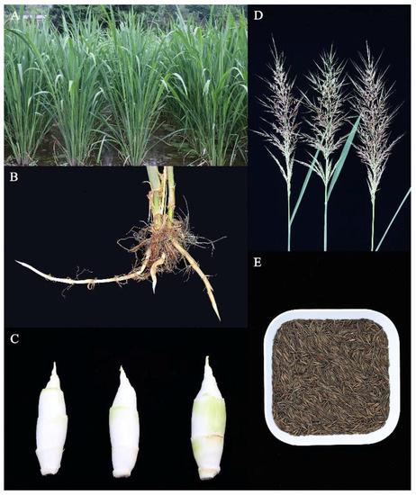As a perennial herbaceous plant, Z. latifolia grows to 1.5–3.0 m (Figure 1A) and its height increases with water depth [9]. It exhibits high water tolerance and normally grows in clusters on wet marshlands, often with emergent plants such as Phragmites australis and Typha angustifolia [10,11,12]. Z. latifolia produces underground as well as surface stems (rhizomes) that form multiple tillers and enable vegetative propagation (Figure 1B). Infection of Z. latifolia by the endophytic smut fungus Ustilago esculenta leads to loss of flowers and seeds, with the stem swelling at the base and forming an edible swollen culm (Figure 1C). The swollen culm is the second most-cultivated aquatic vegetable in China, known as Jiaobai [13,14,15,16,17]. Asexual propagation via infected rhizomes is the only means of Jiaobai production [18]. Long-term artificial selection maximizes the desirable generation of Jiaobai and modulates the evolution of the fungus from a plant pathogen to an entophyte [19]. Similar to other endophytic fungi, U. esculenta infection does not cause leaf chlorosis or death [14,15,16]. During the period of culm gall formation, U. esculenta secretes plant hormones, such as auxin and cytokinin, to stimulate gall formation [20,21]. Environmental factors such as temperature, sunlight, and fertilizer use affect the swollen culm yield [16,22].