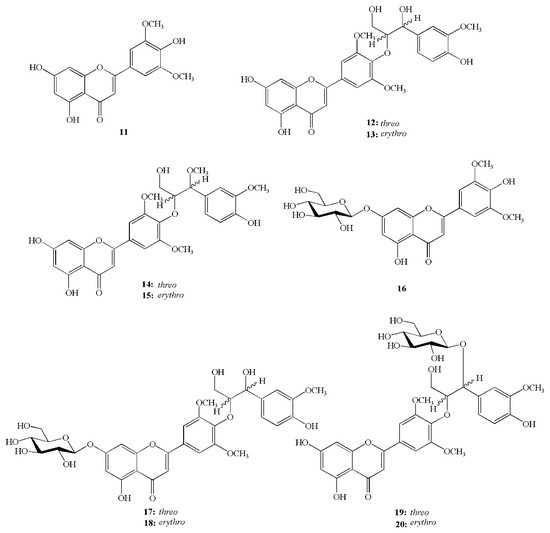 The aerial parts of Z. latifolia have been shown to exert anti-fatigue, anti-inflammatory, and anti-allergic effects [70,71,72,73,74]. A methanol extract of the aerial parts of Z. latifolia inhibits compound 48/80-induced degranulation, antigen-induced β-hexosaminidase release, and PMA plus A23187-induced TNF-α production in RBL-2H3 mast cells [71]. In contrast, the chloroform fraction of the plant tissue suppresses allergic inflammatory response by blocking the release of β-hexosaminidase and TNF-α from RBL-2H3 cells stimulated with dinitrophenyl and bovine serum albumin, and inhibiting the expression of cyclooxygenase-2 and activation of the mitogen-activated protein kinase [74]. Tricin (11, pale yellow powder), salcolin A (12, yellow amorphous powder), salcolin B (13, yellow amorphous powder), salcolin C (14, yellow amorphous powder), and salcolin D (15, yellow amorphous powder) were recently isolated from the aerial parts of Z. latifolia (Figure 3). Compounds 12–15 are tricin derivatives with more potent anti-inflammatory and anti-allergic activities than tricin (11) [72]. In particular, compound 15 strongly inhibits lipopolysaccharide-induced NO production in RAW 264.7 cells, as well as β-hexosaminidase release in IgE-sensitized RBL-2H3 cells. Other compounds isolated from the aerial parts of Z. latifolia include tricin-7-O-β-d-glucopyranose (16, pale yellow powder), tricin-4′-O-(threo-β-guaiacylglyceryl) ether 7-O-β-d-glucopyranose (17, yellow amorphous powder), tricin-4′-O-(erythro-β-guaiacylglyceryl) ether 7-O-β-d-glucopyranose (18, yellow amorphous powder), tricin-4′-O-(threo-β-guaiacylglyceryl) ether 7″-O-β-d-glucopyranose (19, yellow amorphous powder), and tricin-4′-O-(erythro-β-guaiacylglyceryl) ether 7″-O-β-d-glucopyranose (20, yellow amorphous powder) [73] (Figure 3). To develop and use these bioactive compounds, they must be isolated from the aerial parts of Z. latifolia.