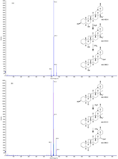 The experiment was performed on an ACQUIT UPLC® BEH column (1.7 μm, 2.1 × 100 mm, Waters, Milford, MA, USA) link to an AB Sciex QTRAP® 3200 (AB Sciex, Toronto, ON, Canada) equipped with an ESI interface for maximum specificity and sensitivity. We employed negative ionization mode to obtain the precursor and product ions of the analytes; the response of the two analytes were very bad. However, all analytes were more efficiently ionized in the positive-ion mode than in the negative-ion mode [24]. For MS/MS detection, we used electrospray ionization (ESI) source in the positive-ion mode. The optimized parameters are as follows: curtain gas, 10 psi; ion source gas 1, 55 psi; Ion source gas 2, 55 psi; source temperature, 450 °C. The optimized mass transitions ion pairs were monitored using MRM mode of transitions from precursor ions to product ions at m/z 432.4→414.4 for peimine, m/z 430.3→412.3 for peiminine, m/z 181.2→124.1 for theophylline. The product ions of peimine at m/z 414.4 and peiminine at m/z 412.3 were detected after both losing H2O. All the product ions were chosen according to the stability and ion response in previous studies [18,25,26,27,28,29]. The innovation of this study was that qualifier ions of peimine at m/z 398.3 and peiminine at m/z 396.3 were detected after losing both H2O and –CH4. The two analytes yielded protonated molecular ions ([M + H]+) as the base peak. The parameters of the fragmentor and collision energies were optimized in order to obtain the richest relative abundance of precursor and product ions. The optimization of the parameters was sensitive and stable, and could be applied to pharmacokinetic investigation of peimine and peiminine [30]. Theophylline was used as the internal standard (IS) as it exhibited a stable response, effective separation, and made this analytical method more accurate.