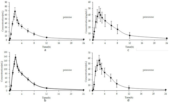 Mean concentration–time profiles of peimine of FU (a) and FT (b); peiminine of FU (c) and FT (d).