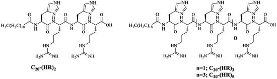 CH3CO-(HR)4: MALDI-TOF (m/z): C50H80N28O10; calcd, 1232.6612; found 1233.5829 [M + H]+; COOH-(CH2)6-CO-(HR)4: MALDI-TOF (m/z): C56H90N28O12; calcd, 1346.7293; found 1347.5835 [M + H]+; CH3-(CH2)10-CO-(HR)4: MALDI-TOF (m/z): C60H100N28O10; calcd, 1372.8177; found 1373.8236 [M + H]+; CH3-(CH2)12-CO-(HR)4: MALDI-TOF (m/z): C62H104N28O10; calcd, 1400.8490 found 1401.6533 [M + H]+; CH3-(CH2)14-CO-(HR)4: MALDI-TOF (m/z): C64H108N28O10; calcd, 1428.8803; found 1429.9110 [M + H]+; CH3-(CH2)7CH=CH(CH2)7-CO-(HR)4: MALDI-TOF (m/z): C66H109N28O10; calcd, 1454.8960; found 1455.6722 [M + H]+; CH3-(CH2)18-CO-(HR)4: MALDI-TOF (m/z): C68H111N28O10; calcd, 1484.9429; found 1485.7854 [M + H]+; CH3-(CH2)18-CO-(HR)5: MALDI-TOF (m/z): C80H135N35O12; calcd, 1778.1029; found 1778.8019 [M]+; CH3-(CH2)18-CO-(HR)3: MALDI-TOF (m/z): C56H79N21O8; calcd, 1191.7829; found, 1192.7028 [M + H]+; CH3-(CH2)18-CO-(HR)2: MALDI-TOF (m/z): C62H104N28O10; calcd, 898.6229 found, 899.3463; [M + H]+.
