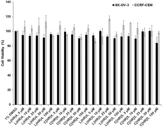 Cytotoxicity study for l(HR)4, l(HR)5, c[HR]4, and c[HR]5 at 5, 10, 25, 50, and 100 µM in SK-OV-3 and CCRF-CEM cell lines after 24 h incubation.
