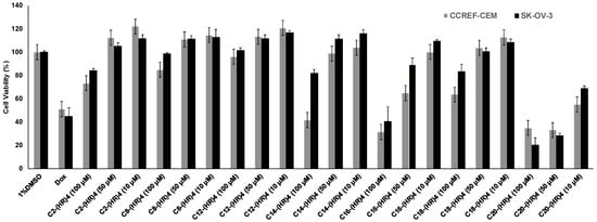 Cytotoxicity study for the fatty acyl-(HR)4 derivatives at concentrations of 10, 50 and 100 µM after 72 h incubation with CCRF-CEM and SK-OV-3 cells.