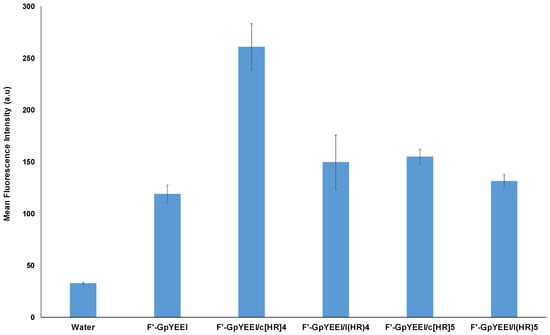 The synthesized conjugated peptides were evaluated for their ability to mediate the cellular internalization for fluorescence-labeled phosphopeptide containing the sequence F′-GpYEEI (where F′ represents carboxyfluorescein and pY represents phosphotyrosine amino acid). Phosphopeptides are considered as reagent probes that mimic phosphoproteins involved in signal transduction. They are usually employed in studying the mechanism of phosphoprotein–protein, protein-ligand interactions, the determination of phosphatases enzyme’s specificity to substrates, and the identification of phosphotyrosine receptors binding domains (PTB) [21,30]. The presence of negatively-charged phosphate groups in addition to the hydrophobic nature of phosphopeptides limited their ability to bypass the cell membrane and reduce their cellular uptake. Consequently, several approaches have been suggested to promote their transportation through the cell membrane into the cell cytoplasm [21,26].