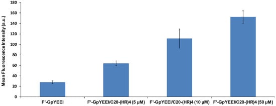 Cellular uptake studies F′-GpYEEI (5 µM) in the presence of C20-(HR)4 in SK-OV-3 cell lines at a concentration of 5, 10 and 50 µM of C20-(HR)4.