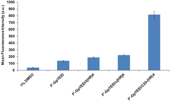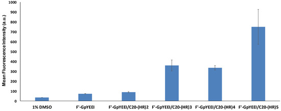 Then we compared the cellular uptake of F′-GpYEEI with C20-(HR)4, l(HR)4, and c[HR]4 at 50 µM in the SK-OV-3 cells. Figure 7 showed that the C20-(HR)4 was found to be the most effective in mediating the cellular uptake of F′-GpYEEI after 4 h by more than five folds as compared to ~2 folds by the c[HR]4 in the SK-OV-3 cells.