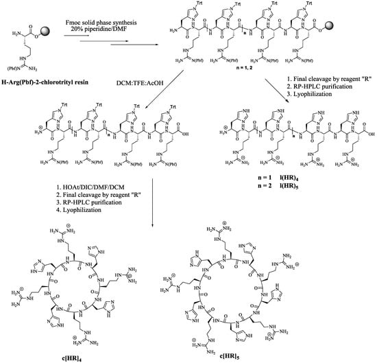 All amino acids were purchased from Chem-Impex International, Inc. All other chemicals and reagents were purchased from Sigma-Aldrich Chemical Co. (Milwaukee, WI, USA). The chemical structures of final products were confirmed by high-resolution MALDI ABX SCIEX TOF/TOF 5800 at the University of California, Irvine, mass spectroscopy facility. The reactions for peptide synthesis were carried out in Bio-Rad polypropylene columns by shaking and mixing under nitrogen using a Glass-Col small tube rotator at room temperature according to our previously reported procedure [20,21,22,23]. The peptides were synthesized by solid-phase synthesis using N-(9-fluorenyl)-methoxycarbonyl (Fmoc)-based chemistry and employing Fmoc-L-amino acid building blocks. Linear peptides, (HR)4, (HR)5 and cyclic peptides, [HR]4 and [HR]5, were synthesized by solid-phase synthesis using NH2-Arg(Pbf)-2-chlorotrityl resin. 2-(1H−Benzotriazole-1-yl)-1,1,3,3-tetramethyluronium hexafluoro phosphate (HBTU) and N,N-diisopropylethylamine (DIPEA) in N,N-dimethylformamide (DMF) were used as coupling and activating reagents, respectively. Fmoc deprotection at each step was carried out using piperidine in DMF (20% v/v). For the peptide synthesis, as representative examples, the synthesis of linear (HR)4, cyclic [HR]4 and fatty acyl lauryl-(HR)4 derivatives are described below.