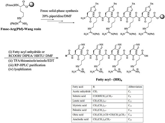 It was expected that the attachment of fatty acids or hydrophobic residues to a cationic CPPs will increase the peptide′s hydrophobicity. Hydrophobicity enhances the interactions with the cell membrane phospholipids leading to increased cellular uptake, and/or modulating both activity and selectivity [25,27,28,29]. Thus, a library of fatty acyl-(HR)4 peptides were synthesized using Wang resin as the solid support as shown in Scheme 2. After peptide assembly on the solid-phase resin, the peptide underwent reaction with a fatty acyl anhydride or other selected fatty acid namely suberic acid (C8), lauric acid (C12), myristic acid (C14), palmitic acid (C16), oleic acid (C18), and arachidic acid (C20) using HBTU as activating agent and DIPEA as a base. C20-(HR)2, C20-(HR)3, and C20-(HR)5, (Figure 1) were also synthesized using a similar procedure to correlate the peptide cellular transporter activities with the number of amino acids residues.