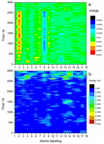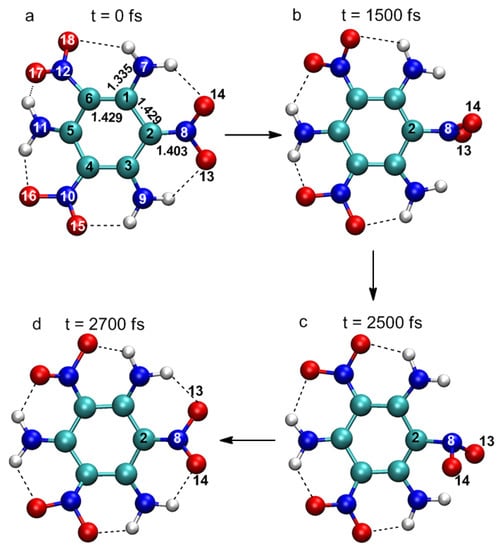 It is worth noting that almost all the excited state intramolecular electron transfers happen between C2 and N8 atoms, as shown in Figure 4a. The color map clearly shows charge transfers between N8 (light blue–dark blue color) and C2 (yellow-red color). Slight charge transfers are observed at N7 and N9. The kinetic energy distribution diagram (Figure 4b) shows a significant rise in the kinetic energy of O13 and O14 at 1500 fs. These O atoms are part of the ANG. This suggests that electronic excitation energy is converted to vibrational energy that is mostly concentrated on the ANG. This could possibly lead to reactions that involve C–NO2 bond breaking, N–O bond cleavage, and ring opening. Indeed, the breaking away of O atom(s) from nitro is a precursor of the generally accepted NO2–ONO isomerization mechanism [16,17]. Nitro elimination and formation of fragments by aromatic ring opening observed in other energetic molecules could also happen in TATB.