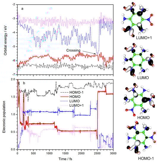 The time evolution of the orbital energies and electronic populations of the HOMO-1, HOMO, LUMO, and LUMO+1 are summarized in Figure 2. Diagrams of the four frontier orbitals are also listed. The electron density in HOMO-1 is mainly distributed between C4 and the linked nitro group and is mainly distributed among C2, C6, and their linked nitro groups in HOMO. Both orbitals exhibit non-bonding (n) character. The electron in LUMO, which shows π* anti-bonding character, is distributed equally among the three NO2 groups, whereas the electron in LUMO-1 is distributed primarily between NO2 at the C4 and C6 positions and their corresponding NH2 groups. The lowest excited state should result from an n→π* excitation, similar to the smaller nitro-containing energetic molecules [25,26,27,28]. It can be seen from Figure 2a that the LUMO energy decreased rapidly after laser irradiation, and HOMO energy increased significantly at the same time. It means the electronic transition from HOMO to LUMO is the dominant excitation. After 500 fs, the energy of HOMO and LUMO fluctuated between −4.4 and −5.8 eV, respectively. At 2500 fs, the energy gap of LUMO–HOMO reaches a minimum of 0.04 eV, and the orbital energies rapidly return to their original values. Figure 2b shows the variation of frontier orbital electron population with time. After laser irradiation, about one electron is excited from HOMO to LUMO, and a small amount goes to the LUMO+1. The excited state decays to ground state after the “crossing” point, as marked in Figure 2a, which corresponds to a LUMO-to-HOMO transition in Figure 2b. The laser frequency used in simulation (3.2 eV) is close to the excitation wavelength used in the experiment (400 nm, i.e., 3.1 eV), suggesting that the density-functional-based tight binding (DFTB) method with parametric quantification is adequate for the calculation of electron energy. Due to a limitation of the Ehrenfest dynamics theory, the excited states decay to a mixed state rather than a pure state, so there is a small amount of electronic population of other orbitals. The simulation shows that with a 100 fs laser duration, the excited state deactivation takes place at 2500 fs. Therefore, the lifetime of the excited state can be regarded as 2400 fs. The experimental results of femtosecond transient spectra [23] show that the excited state lifetime is 6 ps. The calculated lifetime and result experimentally are of the same order of magnitude. Considering the fact that a single TATB molecule was simulated in vacuo without any solvent effect included, it is fair to say the simulation results are consistent with experimental observations.