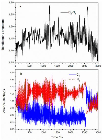 Variations with time of (a) C2–N8 bond length and (b) valence electrons of C2 and N8 atoms in the activated nitro group.