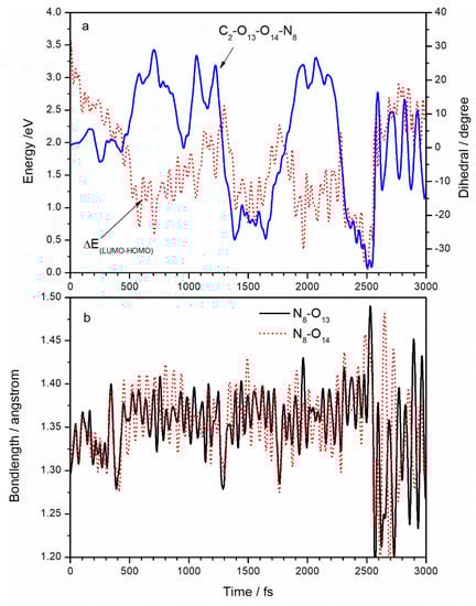 (a) Comparison between the energy gap of LUMO–HOMO and N8 atom pyramidalization; (b) variations with time of N8–O13 and N8–O14 bond lengths.