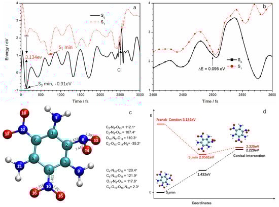 The CI structure is given in Figure 6c. Some critical geometrical parameters are also included. There are significant differences of structure between the ANG and the meta nitro group. In the ground state TATB molecule, the three nitro groups are coplanar with the benzene ring because of the formation of a p–π conjugated system. At the CI, however, the N8 atom is off the plane, forming a pyramid with the C2, O13, and O14 atoms and the N at the meta-nitro group remained in plane. At CI, the bond lengths of C2–N8, N8–O13, and N8–O14 were 1.474, 1.397, and 1.442 Å, respectively; these are essentially sigma bonds. The bond angles C2–N8–O13, C2–N8–O14, and O13–N8–O14 were 112.1, 107.4, and 110.3°, respectively. They are very similar to the bond angles in nonequivalent sp3 hybridization, as in the NH3 molecule. On the other hand, the bond lengths in meta-nitro are shorter than the ones in the ANG and could be regard as π bonds. The bond angles of the meta-nitro are close to 120°, suggesting sp2 hybridization for the N atom. In order to determine the relaxation path involved in the fast internal conversion of TATB from the S1 state, the minimum energy connecting the Franck–Condon (FC) points of S1 and S0 surfaces of TATB to the minimum energy (S1/S0) CI was determined, as seen in Figure 6d. The TD-DFT-calculated vertical excitation energy (here we defined the vertical excitation energy as the S1–S0 energy gap at S0 minimum) for the lowest lying excited electronic states (S1) of TATB is 3.134 eV. The calculated vertical excitation energy is in good agreement with the available experimental [24] excitation wavelength of 400 nm (3.1 eV). Direct comparison of the excitation energy used in experimental work with the calculated vertical excitation energy reveals that TATB is excited below the Franck–Condon (FC) point of the S1 state at 400 nm. Our calculated results are in close agreement with Xiong et al. [23] at the TD-B3LYP/6-311++G (d, p) level. They found that the vertical excitation energy and one S1 minimum were 350.5 kJ·mol−1 (3.63 eV) and 218 kJ·mol−1 (2.26 eV), respectively.