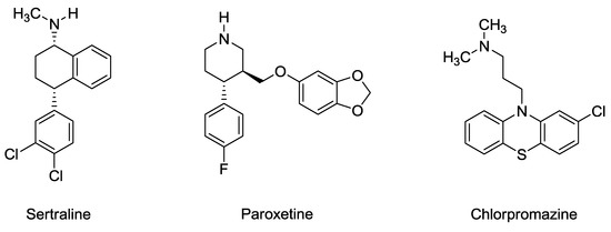 The structures of sertraline, paroxetine, and chlorpromazine.
