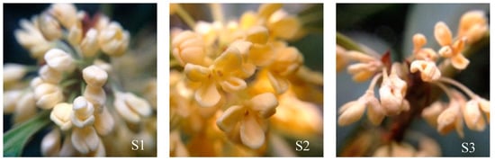 Plants of O. fragrans, “RiXiangGui”, cultivated over decades, were located in the Nanjing Forestry University campus, Jiangsu, China. Three plants (R1, R2, R3) grown under the same conditions were randomly selected as biological replicates. The flowers at initial flowering (S1), full flowering (S2), and final flowering (S3) stages were collected and immediately frozen in liquid nitrogen and stored at −80 °C until use (Figure 1).