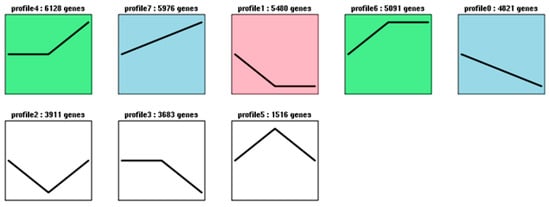 Cluster analysis of the differentially expressed genes. The profiles in color indicate statistical significance (p < 0.01). The number on the topis the profile number and assigned genes. The black lines represent the model expression profiles of different genes.