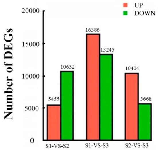 To further investigate the DEGs among the groups, transcriptomes generated from different stages were compared. The DEGs were filtered by using a false discovery rate (FDR) < 0.05 and |log2FC| > 1. Comparing S1 with S2 resulted in 16,087 DEGs: 5455 were up-regulated and 10,632 were down-regulated. When comparing S1 with S3, there were 29,631 DEGs: 16,386 were up-regulated and 13,245 were down-regulated. The comparison of S2 with S3 showed 16,072 DEGs: 10,404 were up-regulated and 5668 were down-regulated (Figure 5).