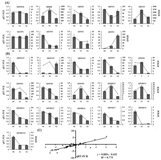 The qRT-PCR validation of DEGs. (A) Expression patterns of genes encoding enzymes possibly involved in terpenoid biosynthesis; (B) Expression analysis of TFs in different flowering stages. Relative transcription level of flowers was set to be 1 (100%). Error bars indicate the calculated maximum and minimum expression quantity of the three replicates. Different lowercase letters labeled on the bars indicate statistically significant differences at the level of p < 0.05. S1, initial flowering stage; S2, full flowering stage; S3, final flowering stage; (C) The correlation analysis of the gene expression ratios between qRT-PCR and RNA-seq.