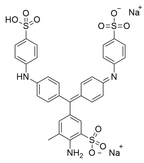 Aniline blue (C37H32N5O9S3, 786.9 g/mol, Figure 1), also known as Potassium nonafluoro-1-butanesulfonate, is an acid mixed dye and was purchased from Sinopharm Chemical Reagent Co., Ltd. (Shanghai, China). This dye is widely used in the textile industry for dyeing wool, silk, and wool blends as well as in dying nerve tissue, cell, and junction tissues during biological studies. In these applications, a certain amount of aniline blue wastewater is produced. Aniline blue solution (50 mg/L) was scanned via a U-300 UV-Vis Spectrophotometer (Shimadzu Corporation, Kyoto, Japan) to obtain a wavelength for maximal absorption. Based on the wavelength, the standard curve of AB was made for the following dye concentration determination.
