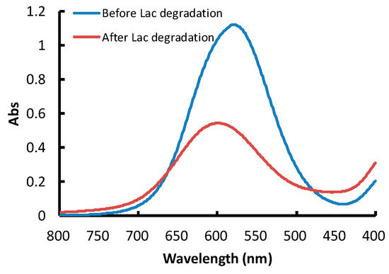 The maximum absorbance of AB solution (50 mg/L) was obtained at 581 nm (Figure 2), which was similar to a previous report [9,16]. The standard curve was determined as: y = 0.023x + 0.006 (R2 = 0.998). With Lac application, the absorption peak was slightly transferred to around 600 nm after 10 min of degradation, and no new absorption peak was found in the visible range. This indicated that Lac could efficiently degrade AB dye into colorless products in the solution.
