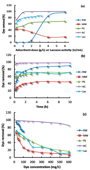 Five variables, i.e., adsorbent/enzyme dosage, contact time, dye concentration, temperature, and NaCl were studied concerning their effect on dye removal. One factor at one time method was adopted, while the other factors remained constant. First, adsorbent/enzyme was examined by varying the dosage/activity, beginning from 0.1 g/L or U/mL with dye 50 mg/L, contact time 4 h, and a temperature of 25 °C, from which a relative best dosage for each was identified: RW 4 g/L, MW 1 g/L, PS 2 g/L, AC 1 g/L, and Lac 1 U/mL. This best dosage was then used for the following investigation. Dye adsorption was conducted for various contact periods within 12 h, with dye concentration 50 mg/L, temperature 25 °C, and a dosage from the above. Dye adsorption was conducted by varying the initial dye concentration in the range of 20–400 mg/L at a contact time of 4 h, a temperature of 25 °C, and a dosage from the above. Dye adsorption was conducted by varying the temperature from 10 to 60 °C at a contact time of 4 h, an initial dye concentration of 50 mg/L, and an adsorbent dosage from the above. Dye removal was also studied in the presence of NaCl, ranging from 0.1 to 1 mol/L.