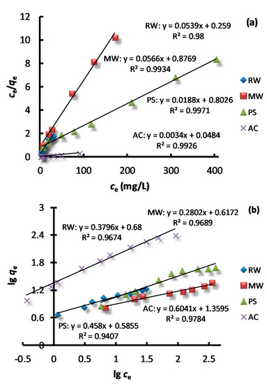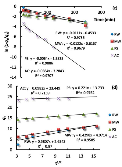 The kinetic equations in Figure 4a,b show that the pseudo second order kinetic model could better describe the adsorption process (R2 = 0.99) than the pseudo first order kinetic model (R2 = 0.97–0.99). The calculated qe,cal values that were obtained via the pseudo second order kinetic model were found to be closer to the experimental values qe,exp, which indicated the applicability of the pseudo second order kinetic model for the RW, MW, PS, and AC adsorption systems. The pseudo first order kinetics suggests the physical adsorption as the speed limiting step, and pseudo second order kinetics suggests the chemical adsorption as the speed limit step [21]. Therefore, the adsorption of AB dye onto four different adsorbents included both physical adsorption and chemical adsorption, and the chemical reaction was the main rate-controlling step throughout most of the adsorption process.