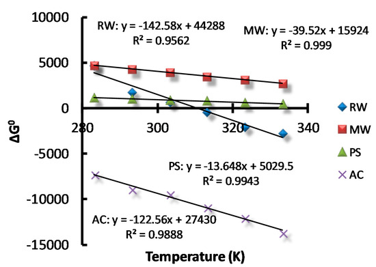 ΔG° was calculated and the corresponding values under the different solution temperatures are reported in Figure 6. Negative values of ΔG° indicate that the adsorption of AB dye on AC was feasible and spontaneous in nature [22]. For the adsorption of AB on RW, the temperature profile generated both negative values ΔG° (T > 310 K) and positive values ΔG° (T < 310 K). By contrast, positive values of ΔG° were obtained for the adsorption of AB on MW and PS. ΔG° > 0 indicates that the adsorption process cannot be spontaneous in the standard state. However, in the actual adsorption process, the system was not in the standard state; therefore, the adsorption reaction could still occur.