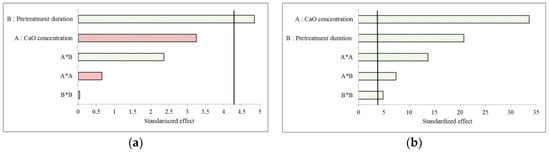Standardized Pareto charts displaying the effects of the different terms of the models are provided for BMP in Figure 1a and for the first-order kinetics constant k in Figure 1b. The duration of the pretreatment (variable B) was the only parameter that significantly affected the BMP (Figure 1a). Moreover, the effect being positive, long contact times between CaO and miscanthus should favor methane production. Interestingly, the pretreatment duration also produced a very significant and positive effect on the first-order kinetics constant k, although this effect was less significant than the effect of CaO concentration (Figure 1b). In addition, both quadratic terms proved to be significant for the first-order kinetics constant k, thus implying that the influence of the variables was not necessarily linear. Finally, the interaction term A × B was also significant, with a positive effect on the first-order kinetics constant. This result could not have been anticipated by using a univariate approach. Although both BMP and k were related, it is noteworthy that both selected variables affected these responses at different levels (positive or negative effect) and with various extents of contribution.