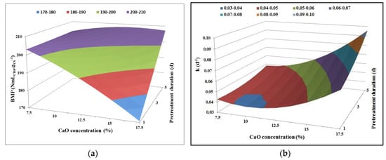 Response surfaces were plotted in 3-D for each parameter (i.e., BMP and k) as a function of CaO concentration and pretreatment duration (Figure 2). The response surface plot for BMP (Figure 2a) led to the following observations: (i) the longer the duration of the pretreatment, the better the BMP, which is the same conclusion as that stated in a previous section; (ii) the more the CaO concentration increases within the experimental domain, the more the BMP decreases. Even if it was not significant, the negative effect of this variable could be anticipated from Figure 1. Consequently, in order to favor methane production, a combination of “low” CaO concentration (lower part of the experimental domain) with “high” contact time for pretreatment (upper part of the experimental domain) could be a viable option.