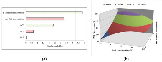 Pareto diagram showing the effect of different coefficient terms on BMP (a) and response surface plot showing the impact of lime concentration and pretreatment duration on BMP in Design 2 (b).