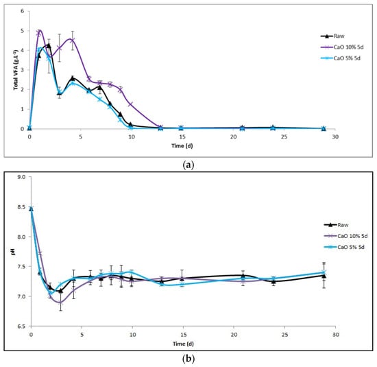 The concentration in volatile fatty acids (VFAs) in the leachate and the evolution of pH were measured each day at the beginning and on a regular basis thereafter (Figure 4). For duplicates, the VFA concentrations were similar (Figure 4a). VFAs were rapidly produced, and their maximum value was reached after 1 day for miscanthus pretreated with 5 and 10% of lime for 5 days (4.5 ± 0.5 g·L−1 and 4 g·L−1, respectively). For raw miscanthus, the maximum was reached after 2 days (4.2 ± 0.1 g·L−1). For all reactors, pH variations were similar (Figure 4b). The evolution of VFA and pH can be separated into two steps. During the first step, the accumulation of VFA during the first 3 days induces, with a brief delay, a slight decrease in pH down to 6.8. Two hypotheses could explain this observation: either (1) the positive impact of higher alkalinity due to CaO or (2) the buffer capacity of manure. The second hypothesis, manure buffer capacity, seems to be more plausible, given that in the case of co-digestion with the raw substrate, the pH is similar to that of the pretreated substrate. The pH did not present a sharp drop and the VFA concentration was not very high either. Moreover, since the VFA/alkalinity ratio remains below 1 (Table 3), the risk of acidification is avoided [] and the drop in pH is swiftly reduced. During the second step, the pH stabilized close to 7.3 due to the decrease in VFA concentrations. After 15 days, there were no more VFAs accumulated; they were simultaneously produced and consumed at the same rate.