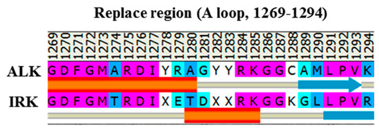 Three available crystal structures of the ALK, namely apo WT (PDB code: 3L9P) [8], the F1174L variant (PDB code: 4FNW) [25] and the R1275Q variant (PDB code: 4FNX) [25], were retrieved to serve as the initial structures for MD simulation to determine a possible structural discrepancy responsible for varied kinase activity. To construct the initial structure for the pY1278 variant, we used the aforementioned inactive apo WT structure (PDB code: 3L9P) for the structural base and replaced the A-loop fragment through homology modeling [32], which disclosed an A-loop from an active form structure of the insulin receptor tyrosine kinase (IRK, PDB code: 1IR3) [10]. Because both ALK and IRK belong to the insulin receptor kinase superfamily with the YXXXYY motif for autophosphorylation in their A-loops, we used the IRK structure, sharing a sequence identity of 41.3% with the ALK sequence, for A-loop homology. The sequence alignment of the IRK sequence against the target ALK sequence is shown in Figure 2. We then phosphorylated Y1278 on the replaced A-loop. The MD simulations were performed using the AMBER 12.0 software package [33,34] with ff03.r1 [35] and ff99SB [36,37] force fields. All hydrogen atoms of the four ALK systems were assigned using the LEaP module, which considered ionizable residues set at their default protonation states at a neutral pH value. Each studied ALK system was immersed in a cubic box of the TIP3P water model (10 Å minimum solute-wall distance), and five, six, five and six Na+ ions were added to neutralize WT, the pY1278 variant, the F1174L variant and the R1275Q variant, respectively. Each solvated ALK system underwent three stages of energy minimization; each stage consisted of 5000 steps of the steepest descent algorithm and 5000 steps of the conjugate gradient algorithm with a non-bonded cutoff of 8.0 Å. In Stage 1, all atoms in the ALK domain were restrained, thereby enabling the added TIP3P water molecules to reorient. In Stage 2, atoms in the protein backbone were restrained, and thus, the atoms in the amino acid side chains were rendered to interact with the added water molecules. In Stage 3, the whole solvated system was minimized without restraint to minimize conformational conflict.