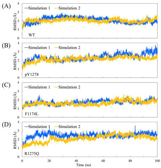 Time evolution of Cα RMSD values for two independent MD simulations of four studied ALK systems: (A) WT; (B) pY1278 variant; (C) F1174L variant and (D) R1275Q variant.