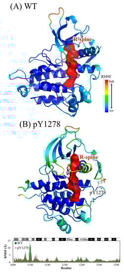 The Cα root-mean-square deviation (RMSD) values for the four studied ALK systems, each system undergoing two independent 100 ns simulation runs, in the production duration given as a function of time are plotted in Figure 3; these values were used to monitor simulation trajectory quality and convergence. The curve of pY1278 Simulation 1 fluctuated at nearly a 2 Å magnitude (with a minimum of 1.8 Å at 71 ns and a maximum of 3.8 Å at 98 ns), whereas the other seven curves fluctuated at a minor magnitude of 1 Å variance. For each studied ALK system, we collected 400 conformations from the two independent MD simulation runs (200 conformations from one MD trajectory within 50–100 ns) and conducted structural and dynamic analysis. Using the 400 collected conformations, the root-mean-square fluctuation (RMSF) per amino acid residue was gauged and plotted over the structure shown in Figure 4. As evident in Figure 4A, concerning WT, the most flexible regions were the β2–β3 loop (scaled in red) and the P-loop (between β1 and β2, scaled in greenish yellow). Notably, the β2–β3 loop was too flexible to be determined in the crystallography solved structure; therefore, the high mobility in the modeled β2–β3 loop was expected. Furthermore, the low mobility on the αC-helix, αAL-helix and distal A-loop was anticipated to maintain ALK inactivity. As depicted in Figure 4B, the pY1278 variant demonstrated notable mobility on the β2–β3 loop (scaled in red), P-loop (scaled in yellow), N-terminal end of the αC-helix (scaled in orange and yellow) and P+1 loop (scaled in green). Figure 4C illustrates that the αAL-helix remained structured despite the F1174L mutation; however, the distal A-loop exhibited high mobility all the way to the P+1 loop, as indicated by the red fragment in the figure. Figure 4D illustrates how the A-loop in the R1275Q variant was entirely destructured and mobile. Moreover, the four residues encompassed by the continuous red surfaces in Figure 4A–D indicate that all four studied ALK systems had assembled R-spines, as mentioned in the Introduction section. Counted from the N-lobe to the C-lobe, the third component of the R-spine was F1271 in the DFG motif only under the condition that the DFG motif adopted a DFG-in conformation, and the pointing-inward F1271 participated in R-spine formation and enforced R-spine assembly.