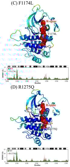Mutations within the ALK domain that promote constitutive, ligand-independent activation are frequently involved in many diseases. Three “hot spot” residues are reportedly involved in 85% of all mutations, namely R1275 (43%), F1174 (30%) and F1245 (12%), where glutamine or leucine is typically substituted for R1275; leucine, isoleucine, valine, cysteine or serine replace F1174; and F1245 is replaced with leucine, isoleucine, valine or cysteine [22,23]. Experimental data have indicated that both F1174L and R1275Q transform ALK into a ligand-binding independent active form, evidenced by the rate constant kcat (in min−1) values of 9.32 ± 0.85 for the wild type (WT), 119 ± 13 for R1275Q, 365 ± 61 for F1174L and 425 ± 63 for pY1278 [24]. In this study, we were interested in F1174L and R1275Q, which are commonly present in patients with neuroblastoma, a childhood cancer [1,25,26]. Figure 1 illustrates that F1174 is at the C-terminal end of the αC-helix and R1275 is situated at the middle of the αAL-helix. Molecular dynamics (MD) simulation has served as a useful tool to correlate protein structure and function at the atomic level [27,28,29,30,31]. In the present study, MD simulations were conducted to evaluate four ALK systems, namely WT, the F1174L variant, the R1275Q variant and phosphorylated WT (the pY1278 variant). Of these, WT is an inactive form, and the other three are active forms; we studied pY1278 to identify the common structural characteristics of the active form in the F1174L and R1275Q variants that correspond to the pY1278 variant. With this study, we wish to link the point mutation to the varied kinase function.