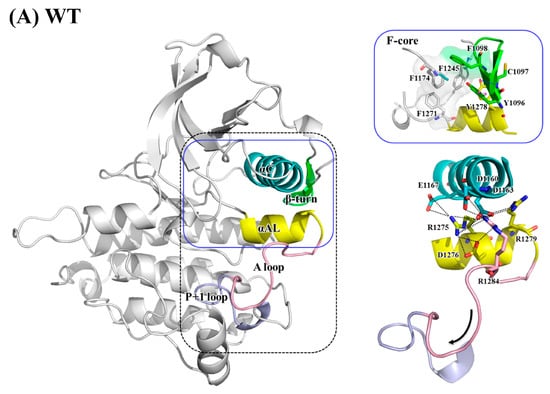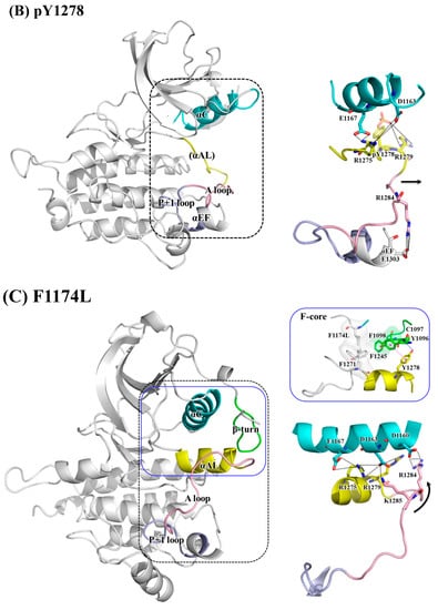 Figure 5C for the F1174L variant shows that the αAL-helix structure still held, as did the interaction between the αAL-helix and αC-helix. Lee et al. found that in WT, a hydrophobic F-core was formed by F1174 (on the C-terminal αC-helix), F1098 (on the N-terminal β-turn), F1271 (on the DFG motif) and F1245 (on the C-loop); when the smaller residue, namely leucine, replaced F1174, the F-core was maintained [41]. Our structural analysis suggested that the F-core became relatively compact because of the smaller L1174; this structural compactness drew the distal A-loop upward, as evidenced by the enhanced salt bridges between R1284 and K1285 (both on the distal A-loop) toward D1160 (on the αC-helix) and D1163 (on the αC-helix), and consequently moved the A-loop upward, as well. Together, these conformational changes rendered the P+1 pocket accessible.