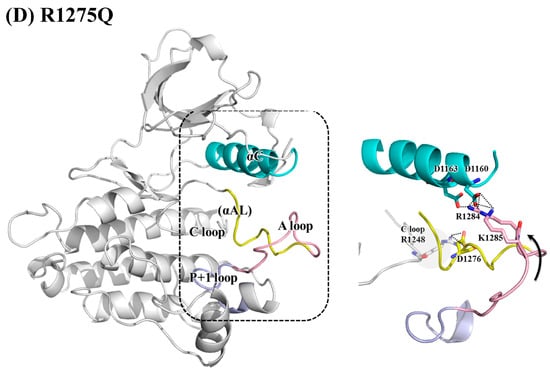 As discussed, R1275 on the αAL-helix plays a dual role, namely securing the electrostatic interactions between the αC- and αAL-helices and preserving the helical conformation of the αAL-helix through the R1275–D1276 interaction. In the R1275Q variant displayed in Figure 5D, the substituted Q1275 no longer linked to D1276, and the detached D1276 moved backward and formed a salt bridge with R1248 on the C-loop. The αAL-helix was distorted and lifted the electropositive R1284 and R1285 to interact with the electronegative D1160 and D1163 on the αC-helix. This upward movement also elevated the A-loop and revealed the P+1 pocket. The conformations that can show the abovementioned interactions were chosen for Figure 5.