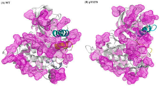 Protein cavity detection achieved using fpocket on (A) WT, (B) pY1278 variant, (C) F1174L variant and (D) R1275Q variant. The purple regions in mesh are predicted grooves for substrate binding. The cavity is searched by a probe, in terms of the alpha sphere, screening along the protein surface. An alpha sphere is a contact sphere that touches four atoms in 3D space without any internal atoms. As for the fpocket parameter setting, the alpha sphere radius was set as 3 and 7 Å for the minimum and maximum, and a cavity must contain at least 25 spheres. Color code: blue for αC-helix, yellow for intact or disrupted αAL-helix, and pink for A loop.