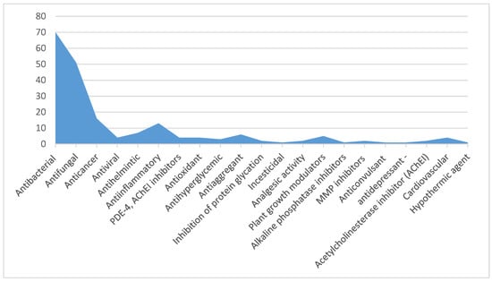Some of the compounds are able to inhibit the non-enzymatic glycosylation of proteins in experiments in vitro [51] and to cause hypothermia in experiments in vivo [52]. Several substituted 1,3,4-thiadiazines were provided as anaesthetic, cardiovascular and hypometabolic agents [53]. With that, even the superficial analysis of published works indexed in databases Scopus, WoS and Pubmed shows that most researchers focused on the antibacterial/antifungal properties of this class of compounds (Figure 1).