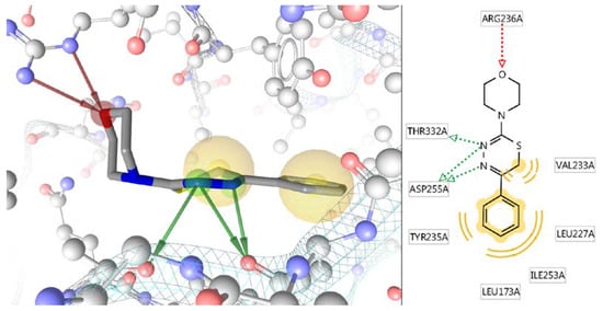 Concerning the most affine to L-17 compound AKT1 kinase with ΔE = −8.4 kcal/mol, an analysis of the molecular binding mechanism was performed using the program Ligand Scout 4.2 Advanced [86] (Figure 2). It is seen that the high binding energy of the L-17 molecule to the AKT1 site was due to 5 hydrogen bonds and two hydrophobic interactions, one of which is very extensive and affects 4 amino acid residues.