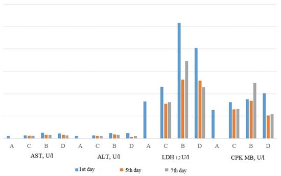 The results of the biochemical study revealed that the activity of AST, alanine transaminase (ALT) and creatine kinase-MB (CPK MB) in the animals on the background of L-17 compound administration was significantly lower than in the animals of the control group (Figure 3). Moreover, on the fifth day of the experiment, the activity of ALT and the activity of CPK MB did not differ significantly in comparison with intact animals. Concurrently, in animals of the control group with experimental MI, the rise of CPK MB activity on the seventh day exceeding the first day’s activity was detected [96]. Considering that the activity of serum CPK in patients with MI is considered as one of the sensitive diagnostic methods of diagnosing myocardial infarction, the repeated rise of CPK activity in the control group might be considered as the sign of MI recurrence [101].