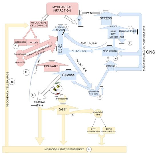 The proposed immunopathophysiological mechanisms of stress-limiting effects of 1,3,4-thiadiazine compounds in myocardial infarction (based on the compound L-17 properties). Legend: blue—the main mechanisms of action of the substituted 1,3,4-thadiazines on the course of stress reaction are highlighted; red—mechanisms acting on the tissue damage; yellow—action of the compounds on the serotonin-mediated disorders of microcirculation. Systemic effects of 1,3,4-thadiazines included: (1) the increase in neuronal stress-resistance mediated through D2 receptors; (2) the increase in synaptic availability of 5-HT, mediated via SERT and M1 receptors; (3) the reduction in the levels of stress cytokinemia, mediated via NET, M1 and D2 receptors; (4) the reduction of stress hormonal response and sensitivity of pituitary-adrenal system mediated through blockade of M1 receptors; (5) the reduction of stress-mediated decrease in insulin production in the pancreas and prevention of stress hyperglycemia due to action on dopamine receptors; (6) the decrease in of blood glucose levels, which, on the background of M-cholinoreceptor blockade, led to the decrease inoxidative stress in tissues. Local effects of substituted 1,3,4-thadiazines included: (i) the reduction of oxidative stress levels and the suppression of the intensity of the local inflammatory process by inhibiting chemotaxis and migration of leukocytes, which was mediated through the blockade of muscarinic receptors and the kinase signal pathway PI3K-AKT; (7) the increased apoptosis, increased macrophage infiltration, decreased macrophage release of proinflammatory cytokines via blockade of D-receptors; (8) the decreased platelet activation and aggregation preventing the development of microcirculatory disorders and, as a consequence, secondary damage to the myocardial tissues (9–10) through a synergistic blockade of the serotonergic and adrenergic systems.