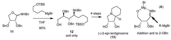 As an exception, the anti addition product was observed by Zhuang et al. [61] in the reaction of the glycosylamine derived from 2,3-O-isopropylidene-d-erythrofuranose with a Grignard reagent (Scheme 4). It was suggested that the reaction takes place by way of a seven-membered-ring complex (e.g., A).