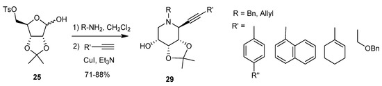 Alkynyl anions [71]: A further extension of this work allowed the introduction of an alkynyl group at the ‘pseudoanomeric’ position: in situ formation of the cyclic iminium ion as before followed by reaction with a terminal alkyne in the presence of a Cu(I) salt gives access to 1-C-alkynyl piperidine iminosugar derivatives 29, in high yield and complete stereoselectivity (Scheme 11).
